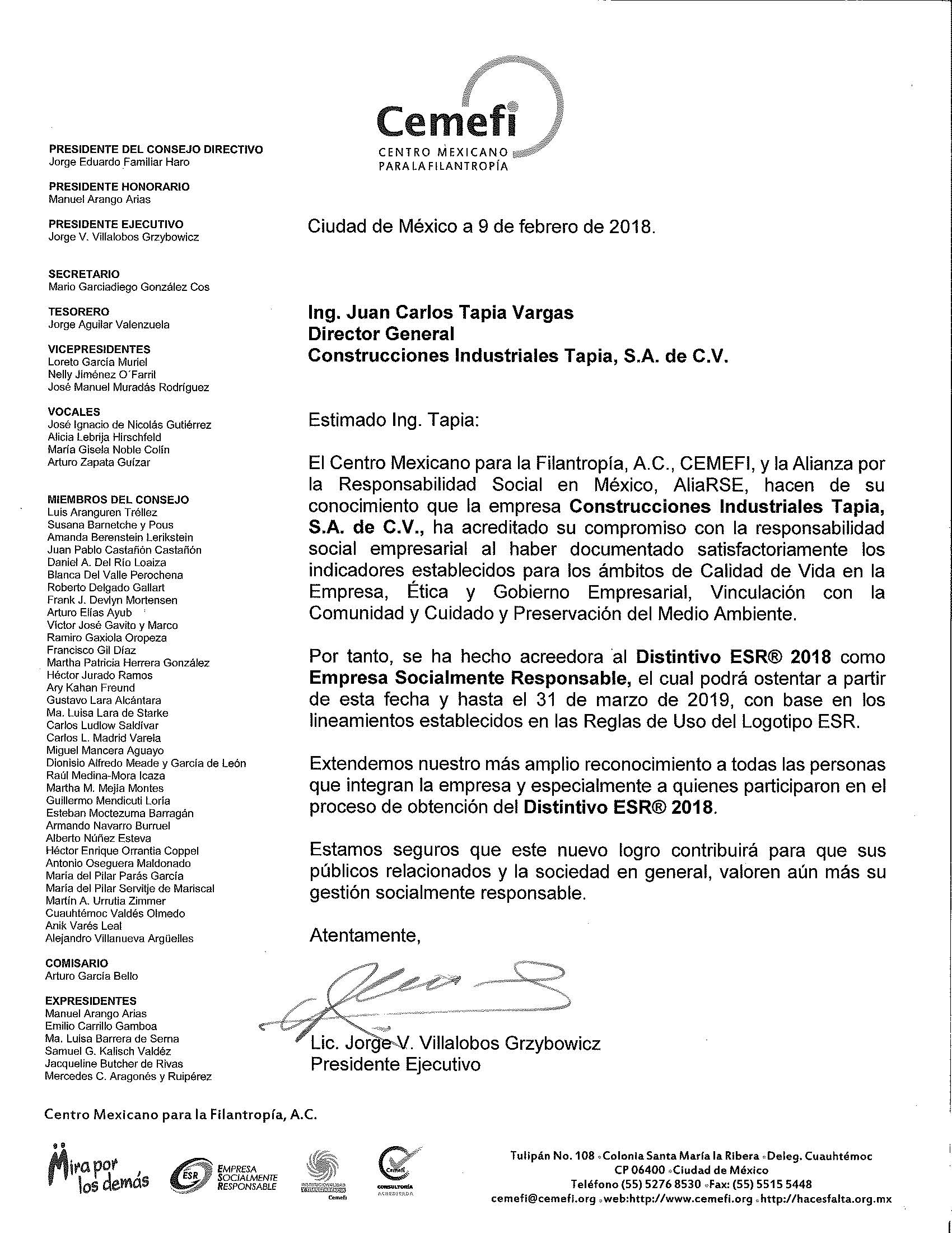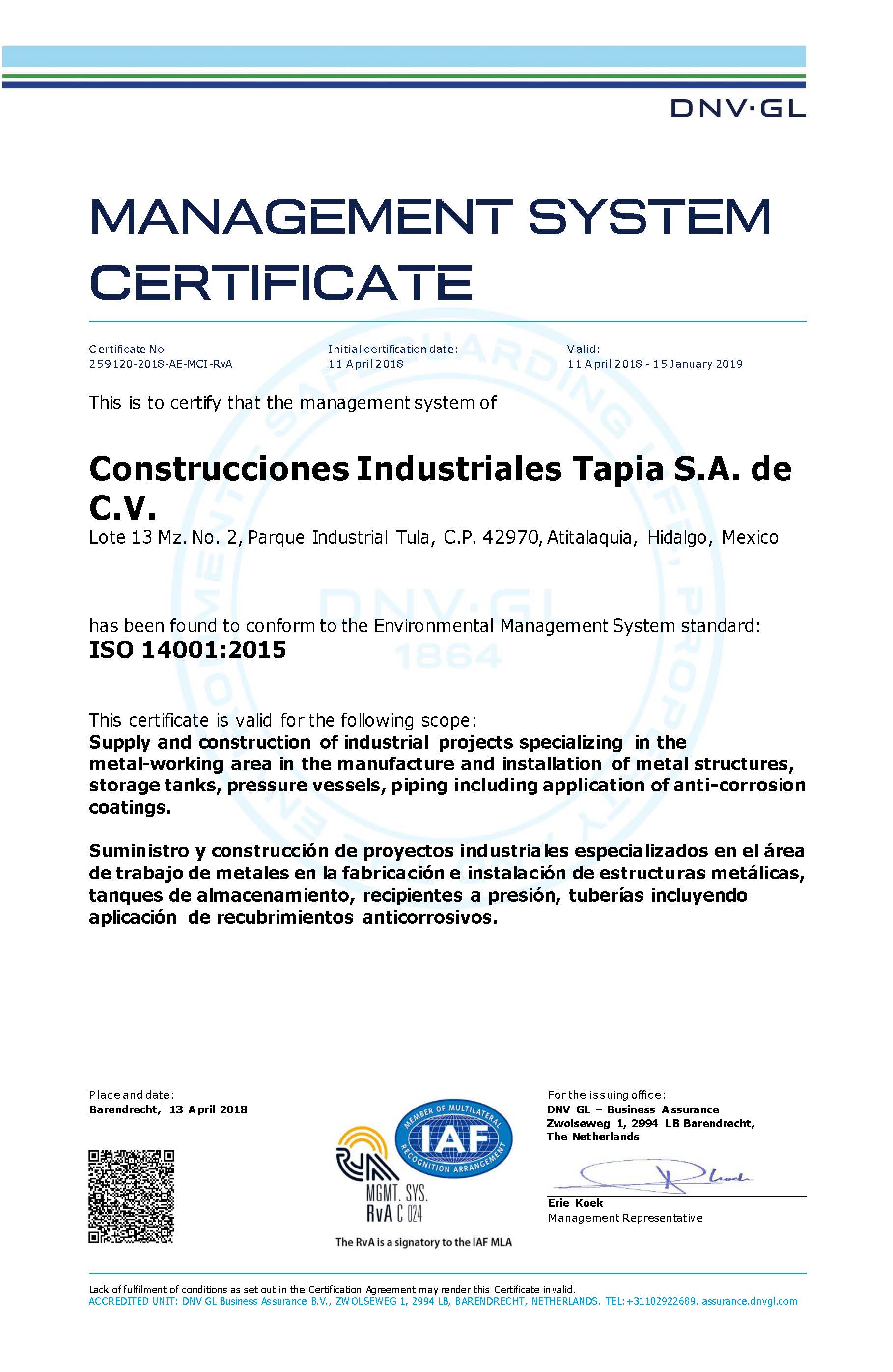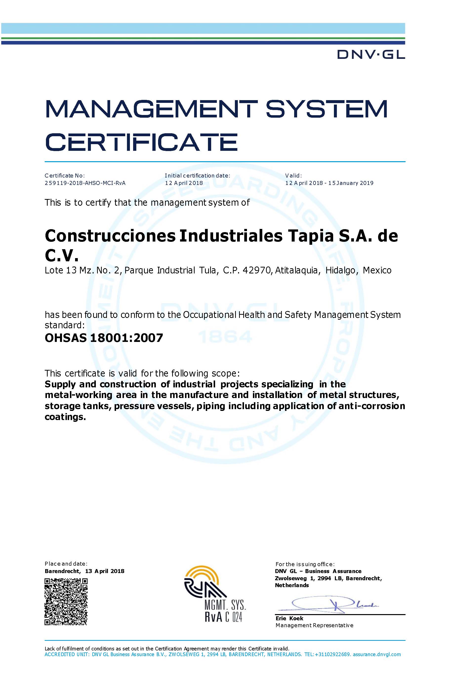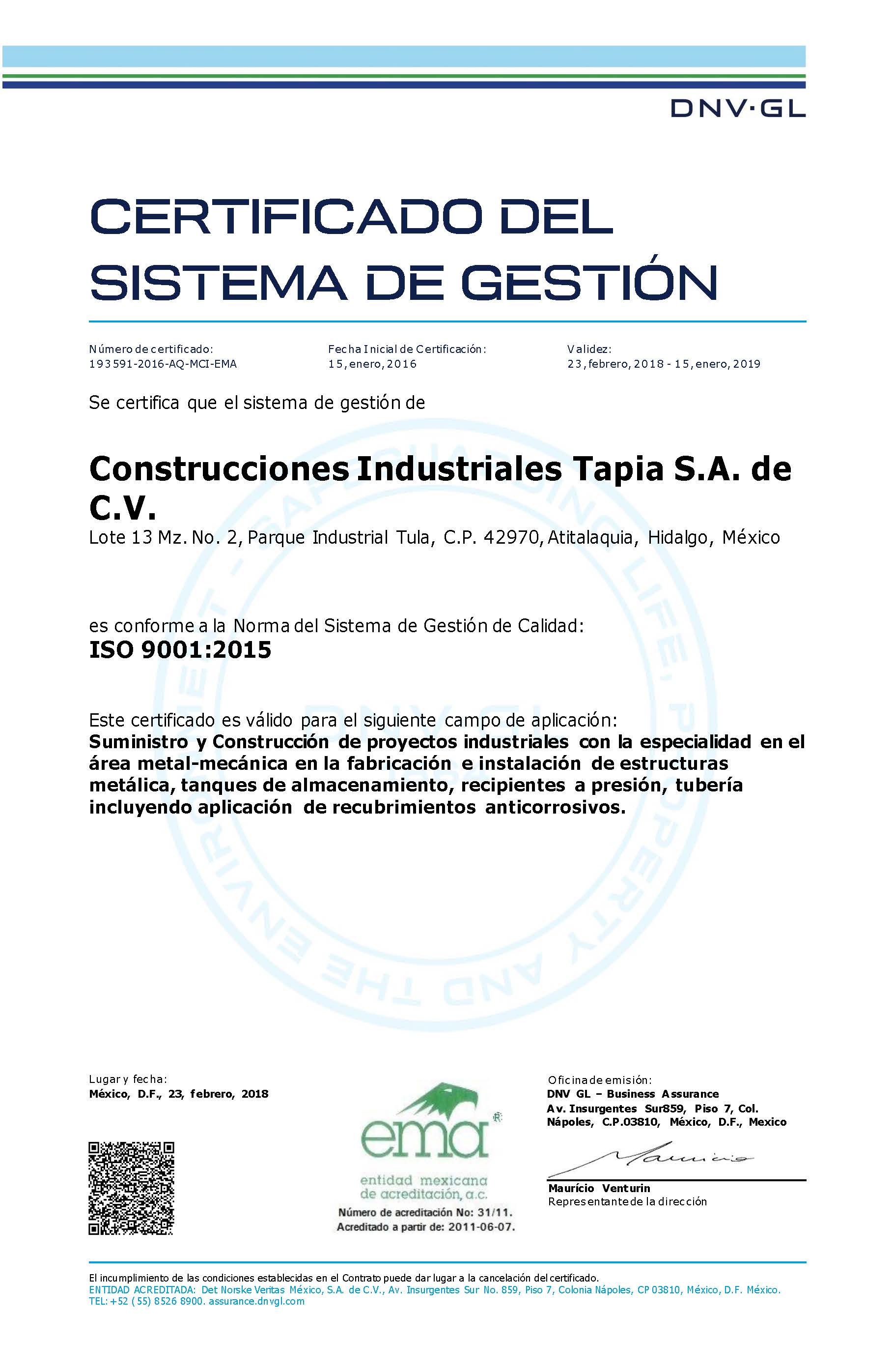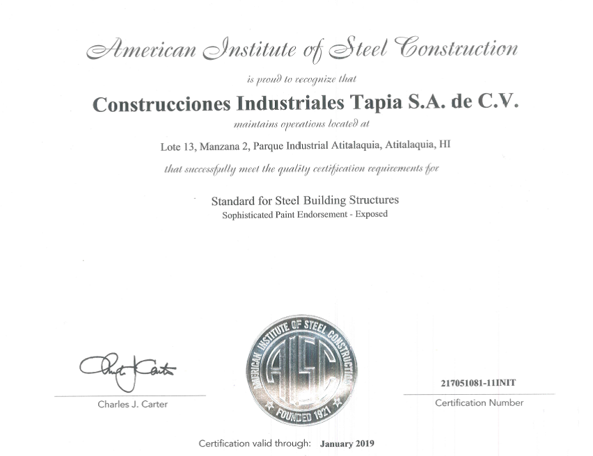 CONSTRUCCIONES INDUSTRIALES TAPIA S.A. DE C.V. Obtuvo en diciembre de 2017 la certificación por AISC (AMERICAN INSTITUTE OF STEEL CONSTRUCTION). Organismo estadounidense con operación en Chicago desde 1921, que establece el estándar de calidad más alto para la industria de acero estructural y forma parte de los programas de certificación de calidad internacional más reconocido para la industria. el principal objetivo del programa es construir estructuras de calidad desde el principio, centrándose en la prevención de errores en lugar de la corrección de errores. La certificación obtenida es como fabricante de estructuras de acero (Standard for Steel Building Structures) y aplicador de recubrimiento (Sophisticated Paint Endorsement – Exposed), mismas que nos servirán para ampliar la confianza de nuestros clientes y garantizar nuestra operación con los más altos estándares de calidad.